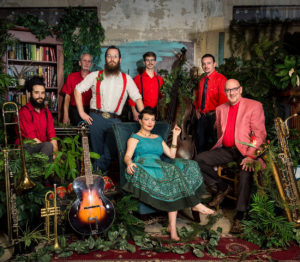 Bumper Jacksons are hot and sweet, painting America’s story from the streets of New Orleans to Appalachian hollers. Unafraid to scrap together new sounds from forgotten 78’s, the Bumper Jacksons elegantly balance paying homage to the traditions while fashioning their own unique, playful style. The group began as a duo, a city-meets-country experiment between songstress Jess Eliot Myhre and banjo player Chris Ousley. They hopped on bicycles, touring the country, instruments on their backs, seeking to reimagine roots music. In five short years, Bumper Jacksons grew to a brassy seven-piece, with horns and pedal steel.